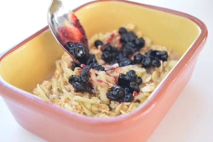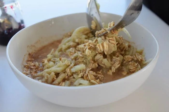 In a small bowl mix the oats with the cinnamon, nutmeg and salt. Add the milk into the oat mixture and stir well. Fold in the grated apple.