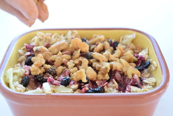 Pour half the oatmeal into the baking dish. Spoon on half of the blueberry compote. Pour over the remaining oatmeal, and top with the remaining compote. Swirl in with a table knife. Sprinkle coconut sugar, cinnamon and walnuts on top. Bake for 15-20 minutes.