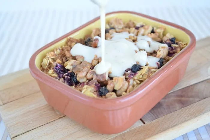 Apple blueberry is a lovely combo for a sweet breakfast. So I recreated the flavors of the Crumbs Apple Blueberry Tart in this delicious baked oatmeal. For a quicker version just add the blueberries to the mix without making the compote, and if you don’t have the vanilla pudding, you can skip that too. It will make the oatmeal less sweet, which many people would prefer. However I have a serious sweet tooth in case you haven’t noticed, and if you do too, then taking those extra steps will make having dessert for breakfast absolutely guilt-free.