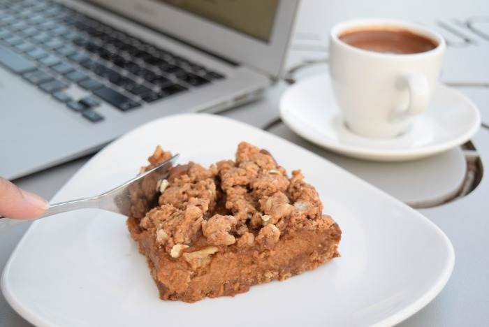 Take out the pumpkin filling from the fridge and spread on top of the oat mixture. Sprinkle with the oat walnut topping.