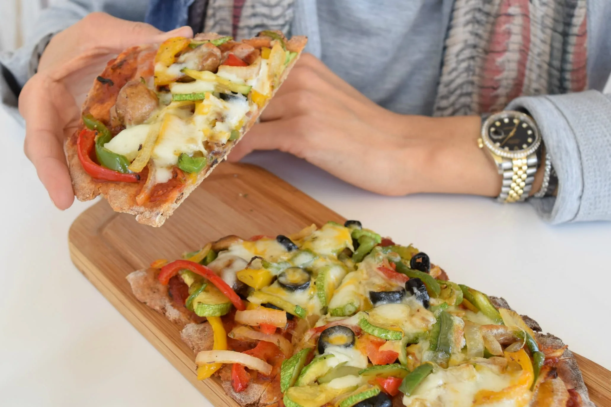 As the years pass and I get older, my love for pizza grows, while the way I like to have it changes. From thick white crust topped with as much cheese as the pizza dough can handle….to thin and crispy, whole-grain and topped with vegetables mostly. The same goes for fatayer…whole-grain, crispy and my favorite fillings are zaater or spinach.
