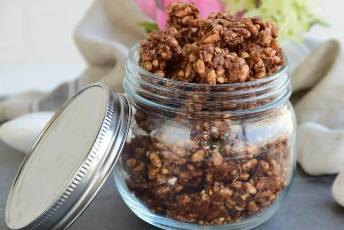 إضافة الحنطة السوداء والأرز البني المنفوخ (أو الرايس كرسبيس) سيكون اختلاف لطيف بدلاً من الشوفان السادة. لقد قمت بإزالة المكسرات من الوصفة, ولكن البندق سيكون مذاقه رائع كما نقوم بإضافته في كرمز لجرانولا الشوكولاتة. إذا أضفتم المكسرات, يجب تخفيض نسبة إحدى المكونات الجافة بنفس نسبة المكسرات حتى نحافظ على التوازن بين نسبة المكونات الجافة والسائلة.