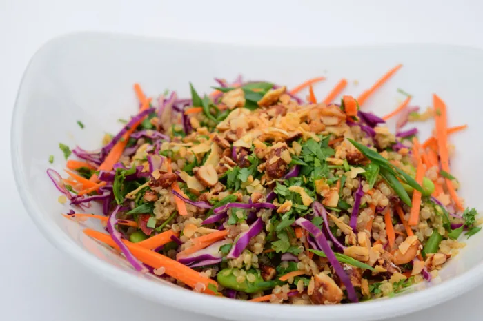 I used quinoa in this recipe to add some protein and make it a main meal. However you can certainly leave out the quinoa if you want it to be grain-free. Since there are no leafy greens in the salad, it is a good make-ahead salad to have on the go. The dressing makes more than you need for this recipe, so don’t add it all at once.