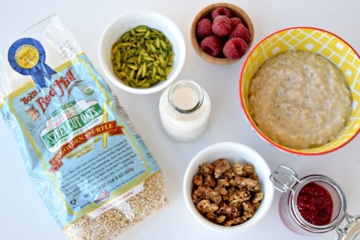Steel cut oats take longer to cook, and soaking them overnight will help bring down the cooking time. But why would you bother? They taste so much creamier than regular oats that it’s totally worth it in my opinion. If you make your own almond milk it would taste even better.
