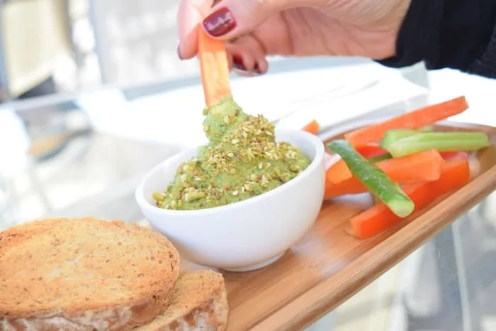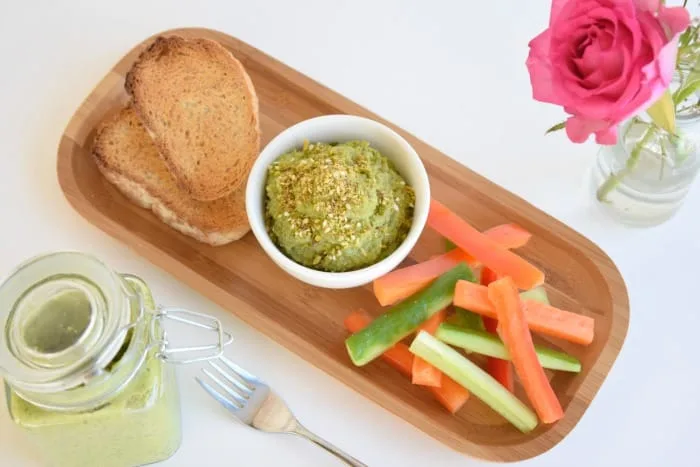 I love pesto…and I love dips! So this dip is a match made in heaven. Dips are so versatile and can be eaten at any meal and in so many different ways. I enjoy them with crudités if I want something light, or spread on a crusty bread, toasted pitta chips or crackers. And they can add so much flavor to a boring sandwich by spreading some deliciousness on the bread before adding your filling.
