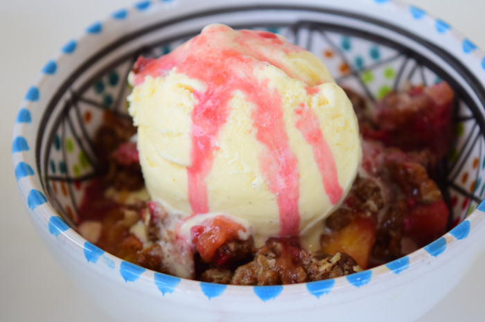 4. Bake for 25-35 mins until the topping is golden brown and the fruit is bubbling. Let cool slightly before serving. The juices will thicken the more it cools. Store any leftovers in the fridge and enjoy for breakfast the next morning.