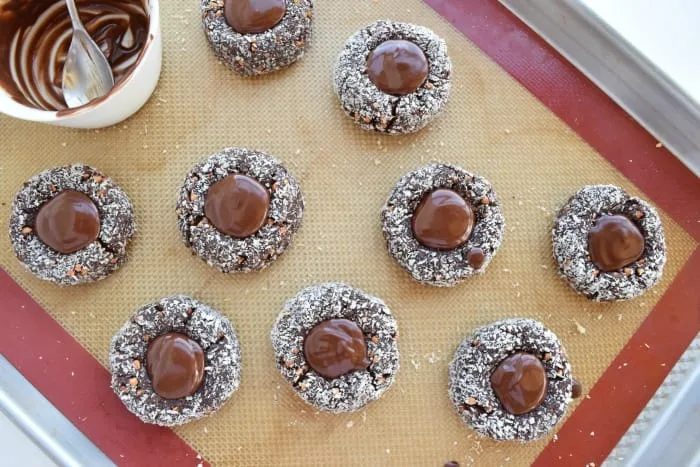 نضع مربع من الشوكولاتة ال85% (حجم مربع الشوكولاتة اللينت Lindt) في وسط العجين (حوالي 40 جرام من العجين) قبل تحويل العجين إلى كرة ثم نتبع الارشادات السابقة.