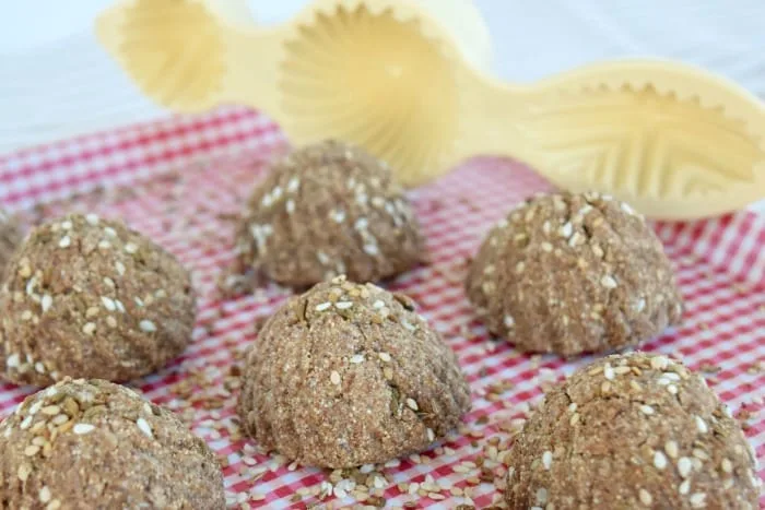 If you don’t have the mamoul molds, just shape it by hand and make it as pretty as possible. The sesame seeds will hide the imperfections anyway. But when it tastes so delicious, and is so good for you, who cares what they look like!