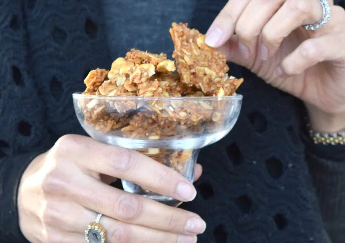 I have a weakness for granola…and if I ever run out of it at home I would literally panic. I also like granola to be baked without dried fruit. Dried fruit doesn’t need to be baked…and it doesn’t need to have that sweet coating that’s added to the mixture. So I just add whatever I’m in the mood for at the time. I also like granola mostly on it’s own with a cup of tea or coffee….and that’s why I make sure any granola I make is nice and chunky.