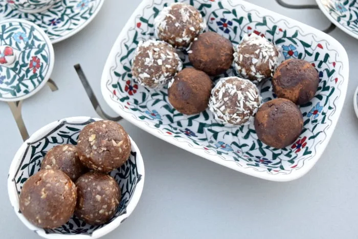 وهنا تأتي كرات التمر … أنتم مبدئياً تخلطون التمر مع مكسرات, بذور, و أي نوع من أنواع الاطعمة الخارقة أو النكهات التي تحبونها في محضر الطعام لعمل وجبة خفيفة لذيذة أو تحلية.