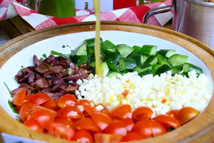 Have all the ingredients for the salad chopped and diced and ready to go. Then mix the dressing ingredients together and set aside. Have your serving bowl also ready.