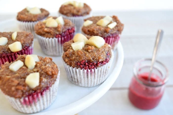 Scoop about half a tablespoon into each muffin case. Add a teaspoon of the jam, then distribute the remaining macadamia batter on top. Decorate with some chopped macadamia nuts.