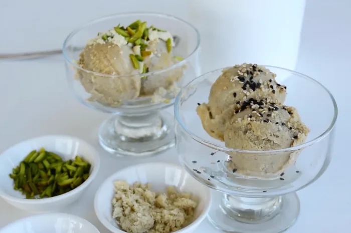 4. Place in the freezer to firm up. Serve as is with crumbled halwa or a sprinkle of pistachio.